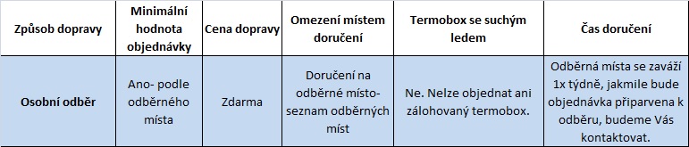 Minimální částka pro osobní odběr je 3000 korun na jednu objednávku, podle místa určení. Pokud Vaše objednávka přesáhne tuto částku,automaticky se Vám nabídnou místa pro osobní odběr. Na odběrná místa nelze objednávat vážené produkty.